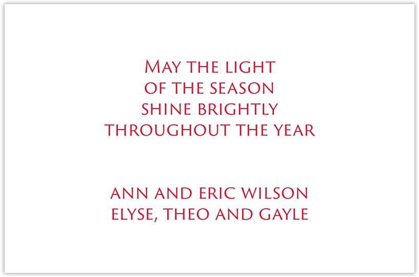 Folded Holiday greeting card (fold at top) printed on carbon-neutral environmentally-friendly white cardstock.