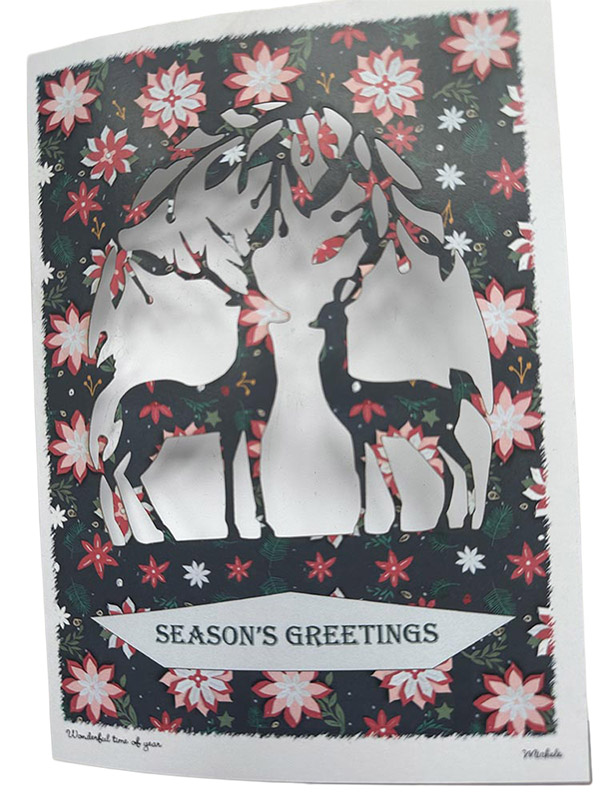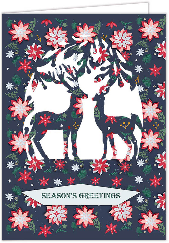 Laser cut card, silhouette cutout of two deer standing in the snow.