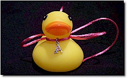 uniquely packaged with pendant on cord tied around a rubber duck's neck.