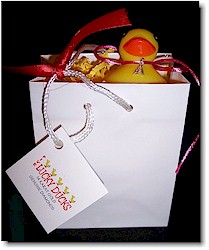 Duck is placed on top of yellow shredded paper inside a white gift bag.