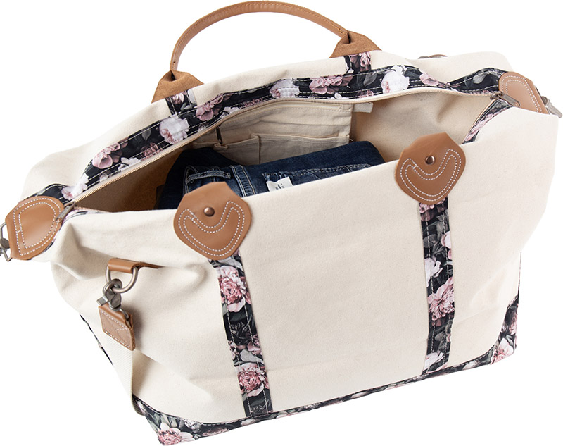 In addition to ample storage space, this popular weekend getaway duffel features a top zip closure, inside zip pocket and two standard wallet sized pockets.