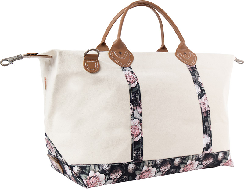 This tote bag is equipped with two genuine leather handles and a detachable shoulder strap, It's sure to keep you traveling in style comfortably. This natural canvas body bag features a deep contrasting trim, leather accents, and antique brass hardware.