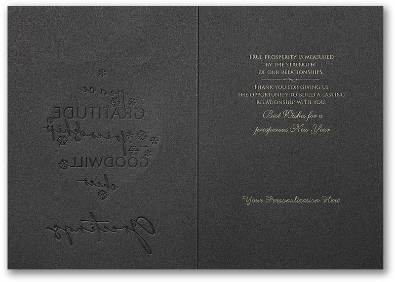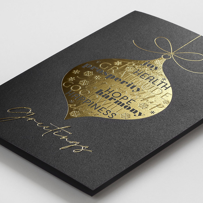 A gold foil ornament filled with seasonal wishes shines on the rich black paper of a holiday card that radiates elegance. It's a timeless expression of warmth and joy, perfect for sharing the spirit of the season.