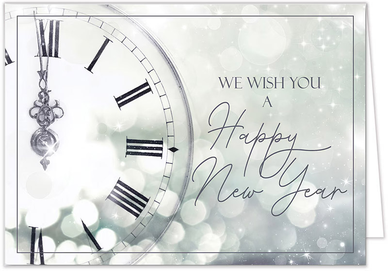 The old year ends as the clock strikes midnight! Start the new one right by wishing customers a Happy New Year with this striking holiday card.