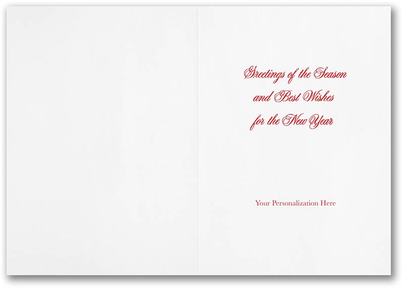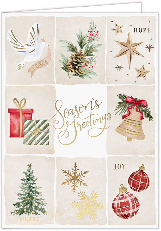 Seasonal symbols create a delightful mosaic of holiday cheer on a holiday card that offers the "Season's Greetings" printed in gleaming gold foil. A dove, a Christmas tree, stars and more bear wishes for peace, hope and joy surround the greeting.