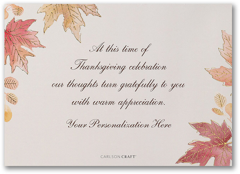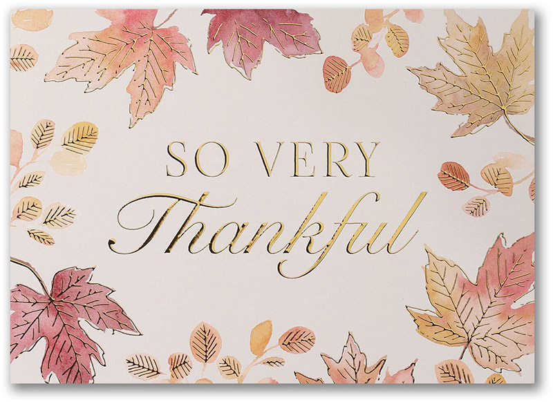 Express gratitude with a customer appreciation card where "So Very Thankful" shines in enhanced raised foil. The greeting, framed with vibrant autumn leaves veined with shimmering foil, captures the season's warmth. Foil-trimmed leaves on the back of this flat holiday card create a memorable frame for your personalization.