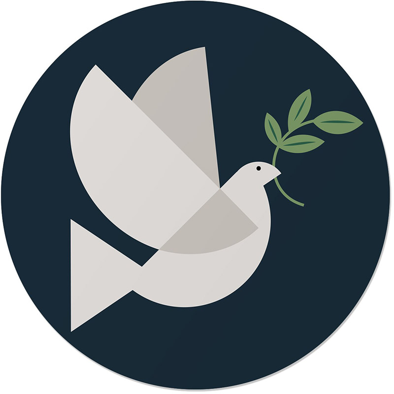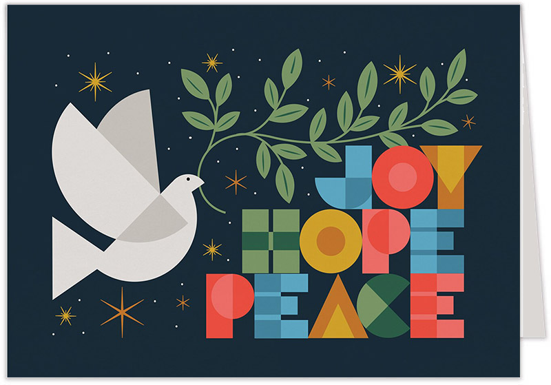 The playful and eye-catching graphics of this holiday card captures the spirit of the 1970s. From the retro typography to the geometric forms of a dove carrying an olive branch, it's a groovy homage to mod design that spreads peace and joy with a funky and festive twist.