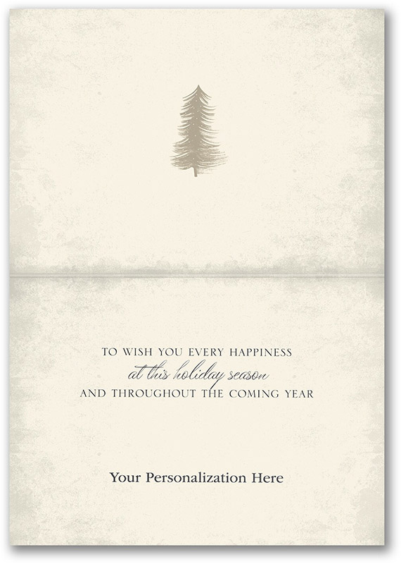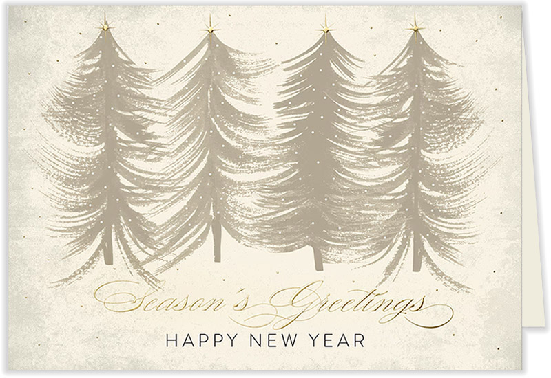 Whimsical evergreens and a snowy sky create a calm, refined scene. This folding holiday card features enhanced raised foil and a natural palette with soft, seasonal warmth.