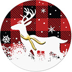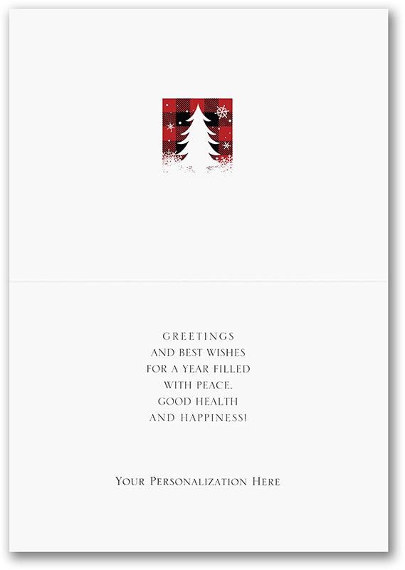 A red buffalo plaid background sets the scene for white pines, falling snow, and woodland creatures. Enhanced raised foil adds shimmer to this bold and festive folding holiday card.