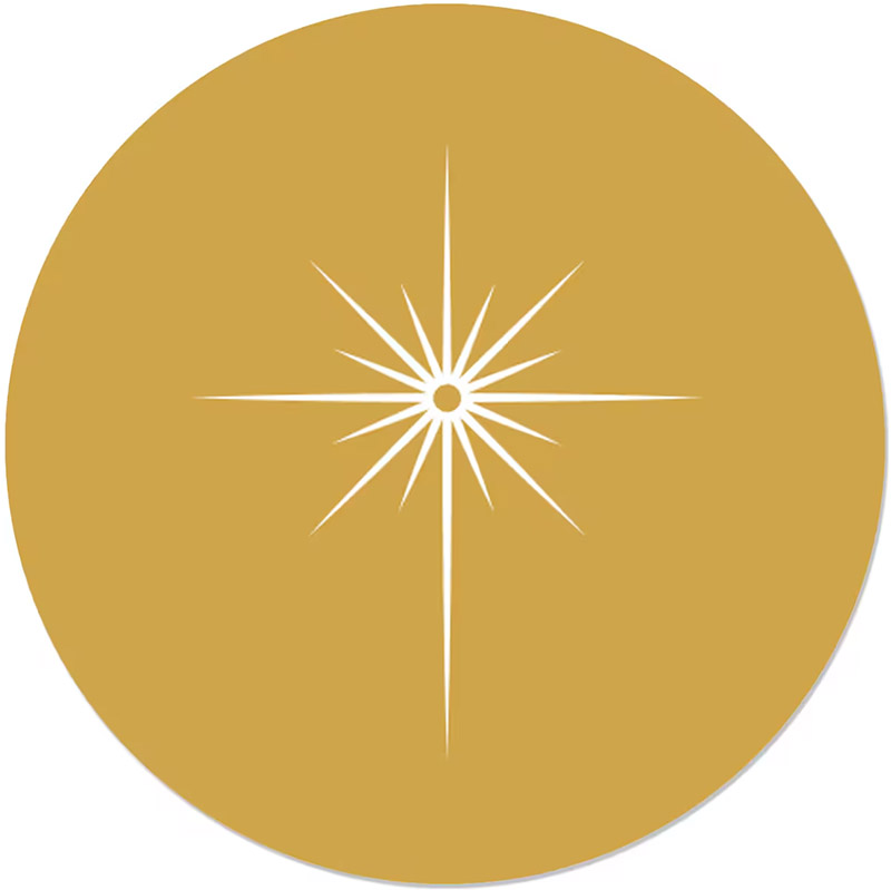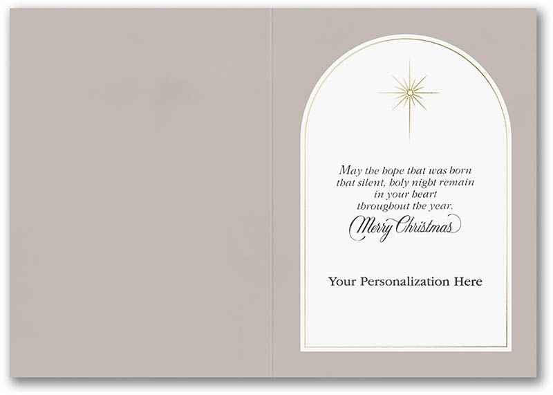 A radiant gold star shines above a graceful illustration of the Holy Family. This folding holiday card features enhanced raised foil for a glowing, heartfelt expression of faith.