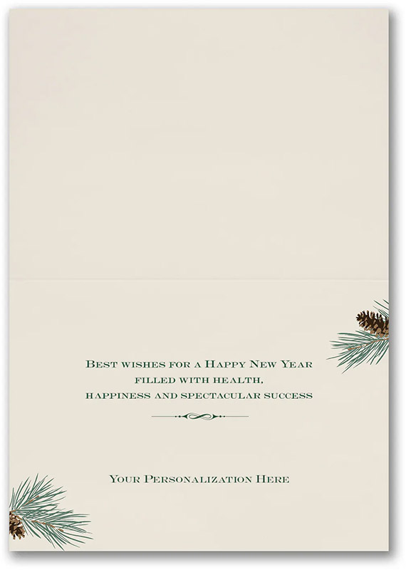 A simple sprig of pine in soft watercolor sits inside a thin gold frame. Digitally printed, this folding holiday card is understated and serene.
