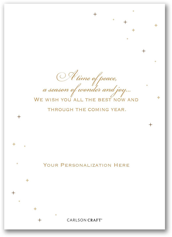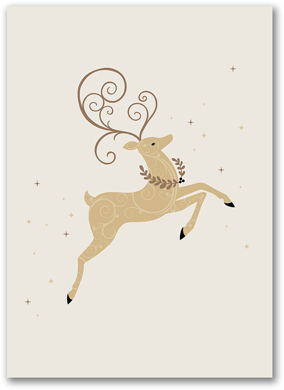 A graceful and whimsical reindeer leaps across a soft background surrounded by swirls and falling snow. Digitally printed for a light and refined holiday greeting.