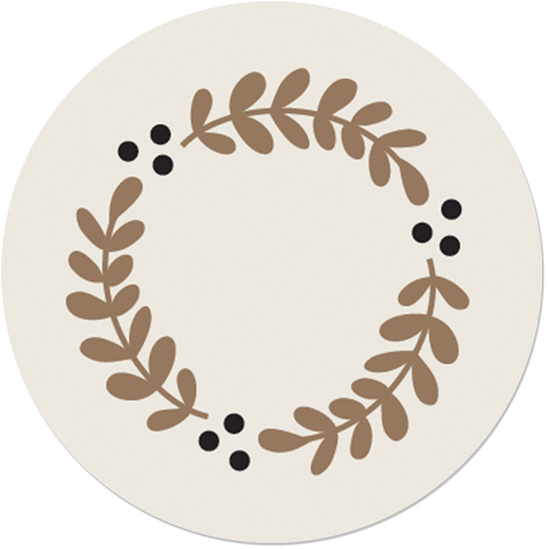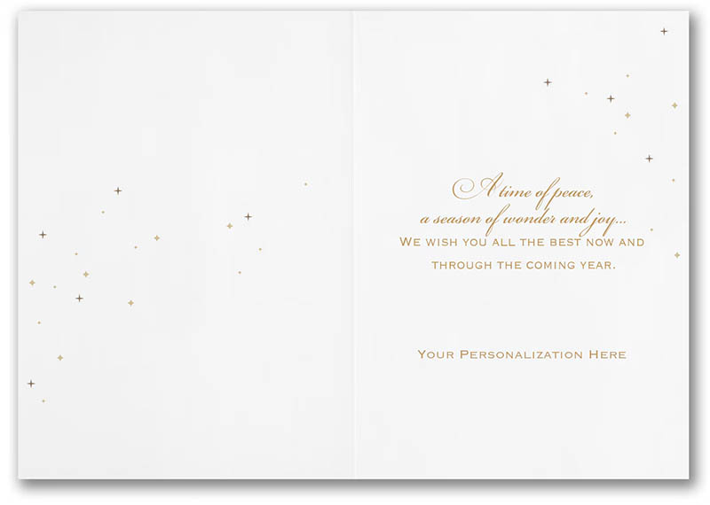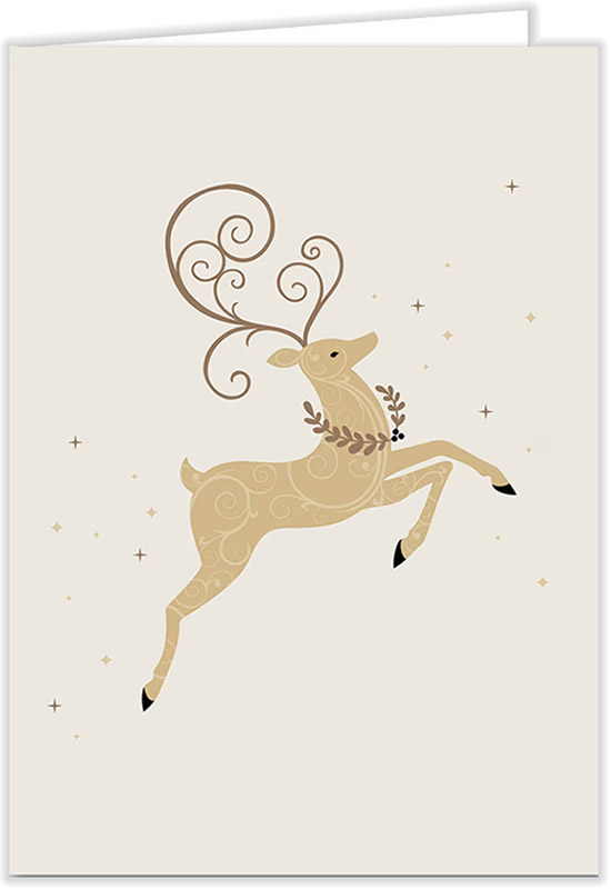 A graceful and whimsical reindeer leaps across a soft background surrounded by swirls and falling snow. Digitally printed for a light and refined holiday greeting.