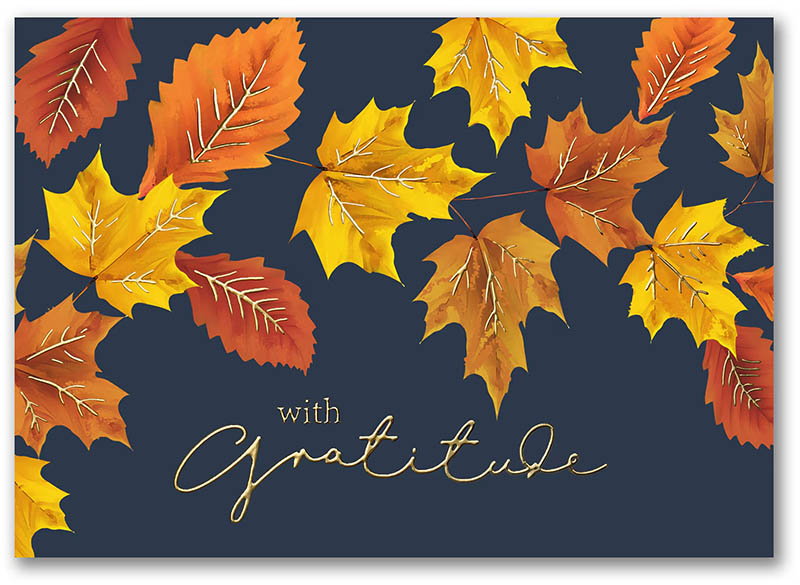 Falling autumn leaves in warm orange and gold tones surround the words "with Gratitude" on a dark colored background. Enhanced raised foil adds a shimmery touch to this seasonal thank-you card.
