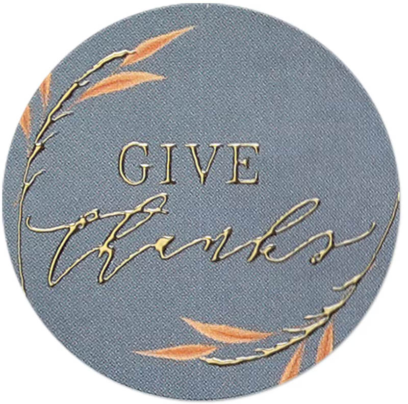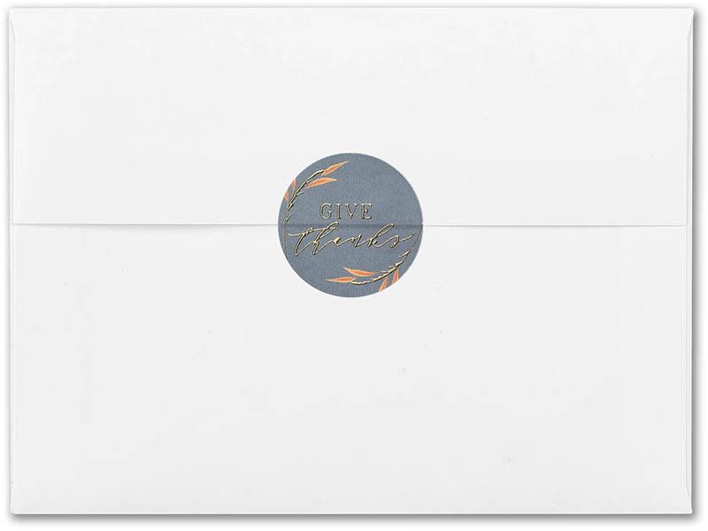 A beautiful celebration of autumn, these envelope seals feature a rich and inviting color scheme that captures the spirit of the season. "Give thanks" shines in enhanced raised foil against a warm autumn-blue background.