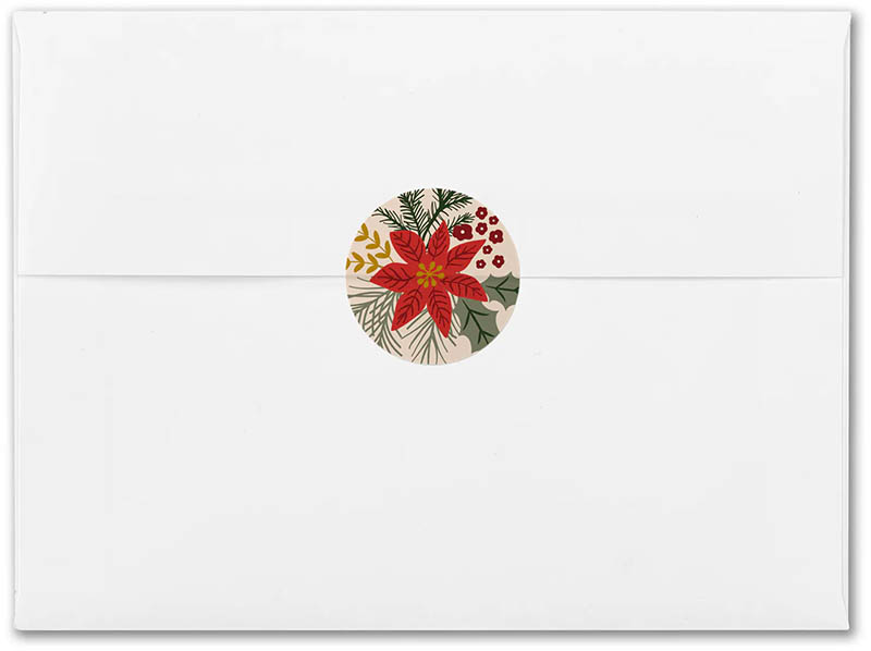 A poinsettia is the centerpiece of the contemporary floral design decorating envelope seals that will add a touch of joyous style to holiday cards and letters.