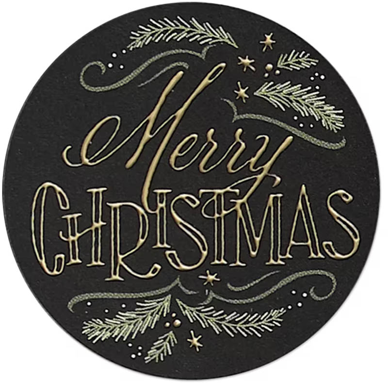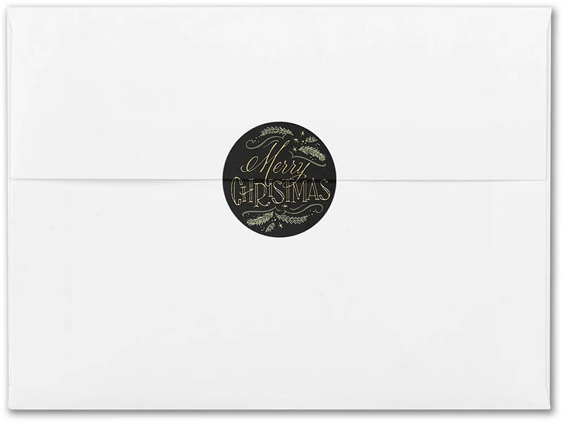 Dramatic and contemporary, this envelope seal will make an impression even before they open their card. Enhanced raised foil adds texture and shines as it spells out "Merry Christmas" against the seal's black background.