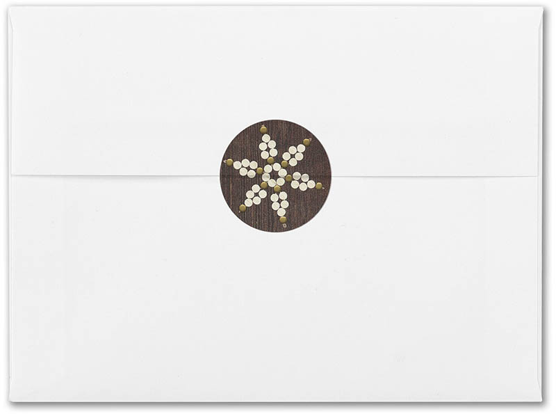 A beaded star ornament shines with enhanced raised foil on envelope seals that combine a rustic faux woodgrain with an on-trend design.