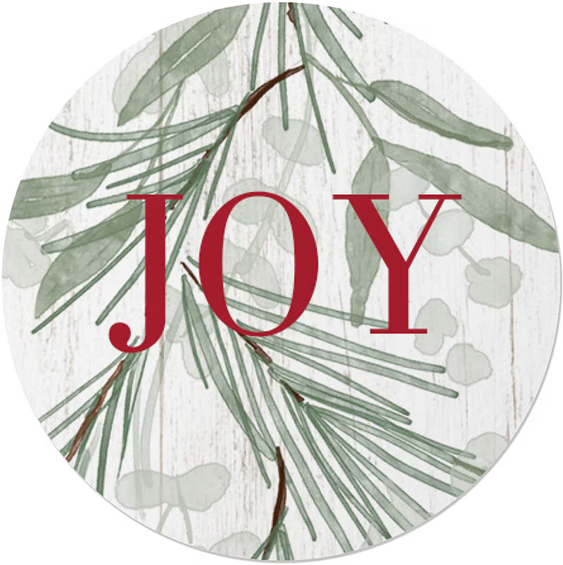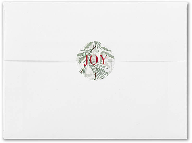 The rustic greenery design decorating these charming envelope seals will add a touch of "Joy" to holiday correspondence.