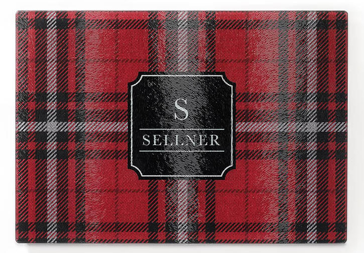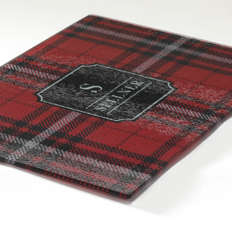 A red tartan plaid background adorned with a graceful reindeer silhouette, a single initial monogram, and your family name gives this rectangle cutting board the perfect blend of style and functionality.