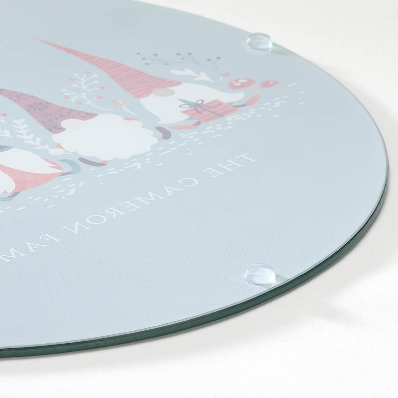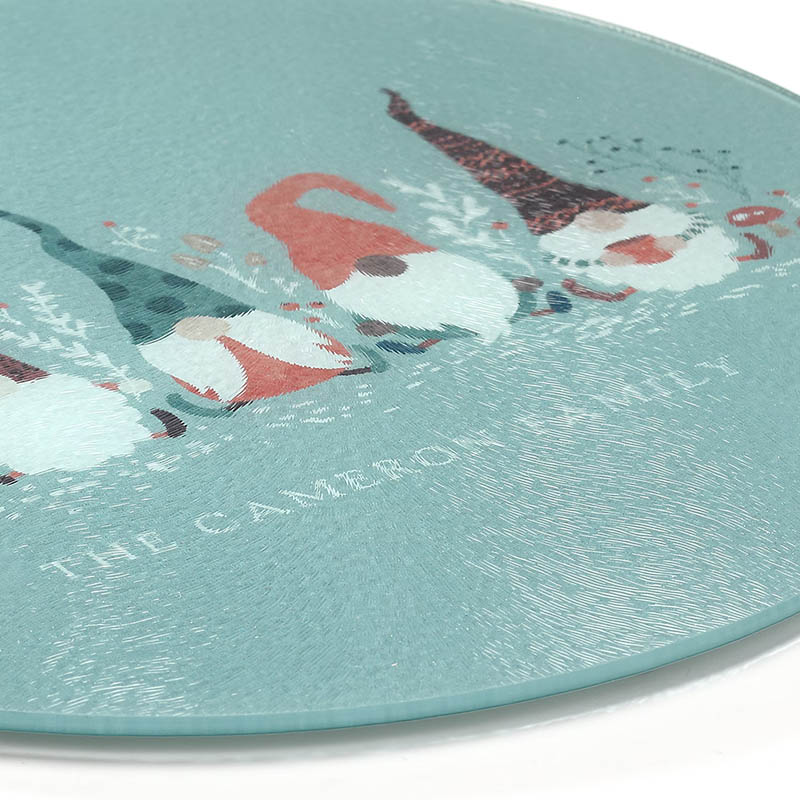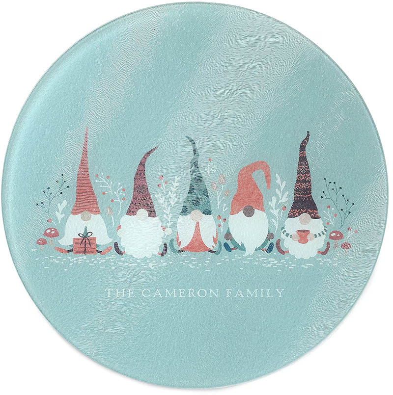 All who find joy in sprucing up their homes with festive decorations and adding a touch of seasonal magic to their everyday routines will love the whimsical gnomes sitting above their personalization on this round glass cutting board.