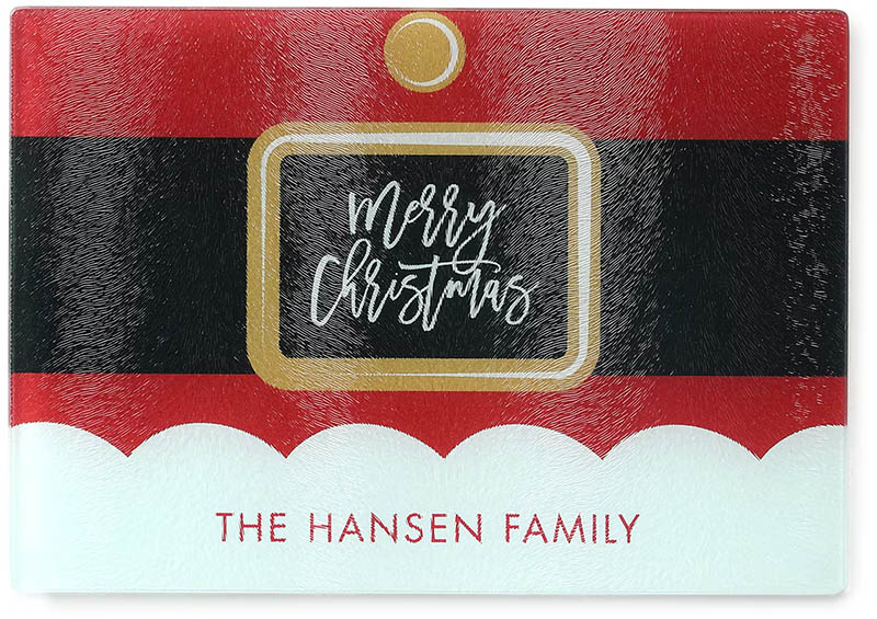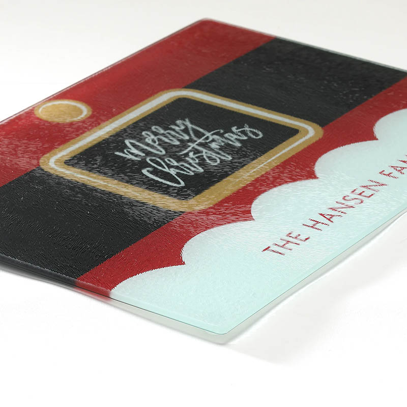 Ho, ho, ho! Make your kitchen merrier with a glass cutting board inspired by Santa's iconic red suit. Its belt buckle is placed front and center on the rectangle cutting board, framing a custom message. The "fur trim" on Santa's coat offers space for additional personalization.