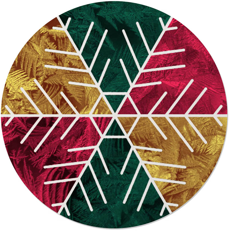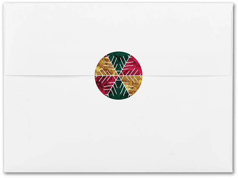 A geometric snowflake pops against a festive red, green, and gold background to ensure your holiday correspondence gets noticed! These round, self-adhesive seals are the perfect finishing touch for all your holiday correspondence.