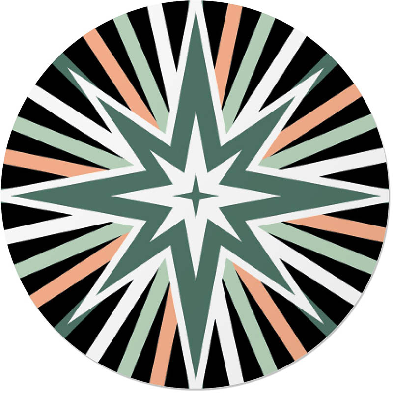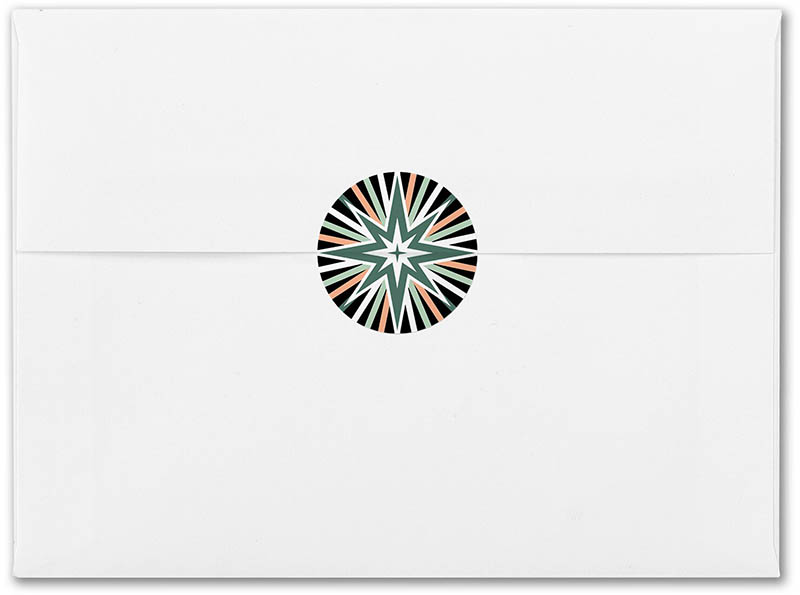 A mid-century modern star takes center stage on self-adhesive envelope seals that will add a touch of retro-cool to your holiday cards and letters. Non-traditional shades of black, white, green and peach make a stylish statement on these peel-and-stick seals.