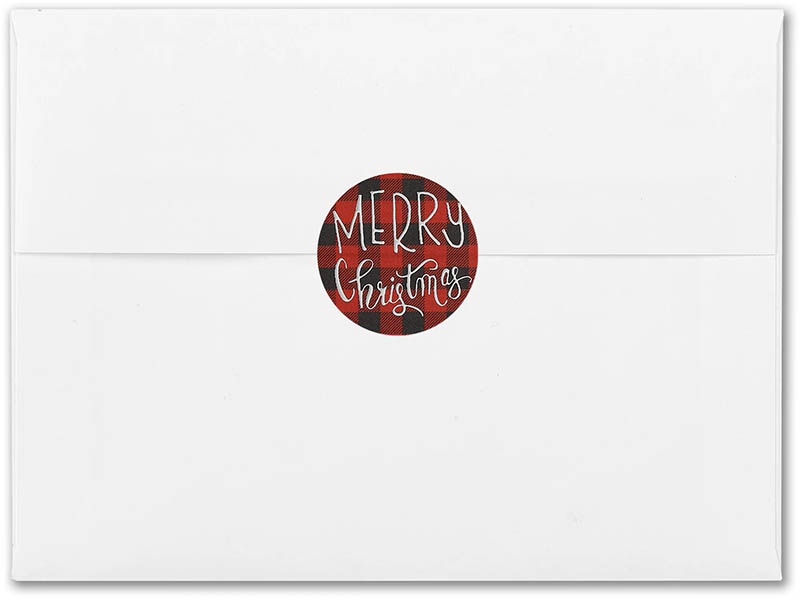 "Merry Christmas" shines in enhanced raised foil against the red and black plaid background of self-adhesive envelope seals that will add a little country charm to holiday cards and letters.