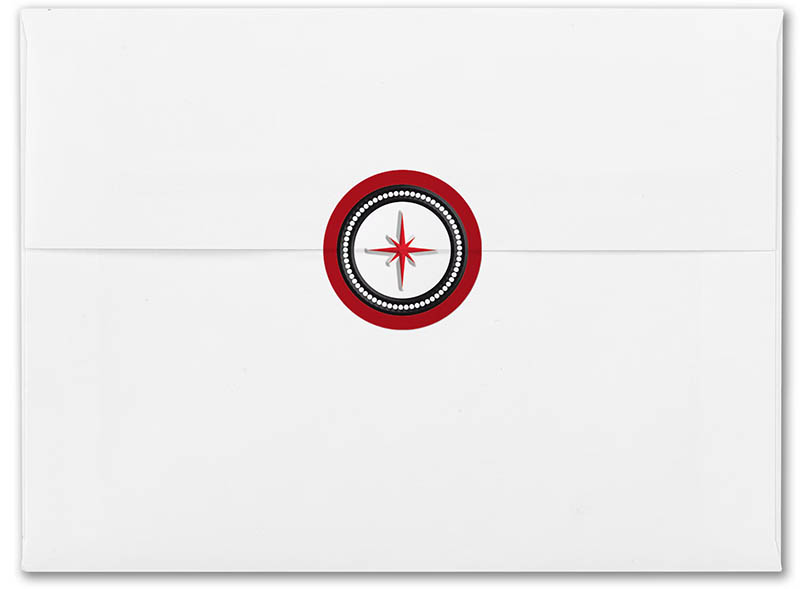 Embellish your holiday cards and letters with contemporary self-adhesive envelope seals featuring a striking black, white, and red color scheme encircling a modern Christmas star design. These peel-and-stick seals are the perfect finishing touch for all your holiday correspondence.