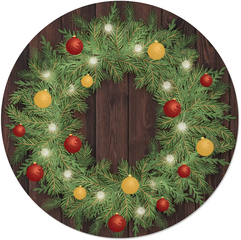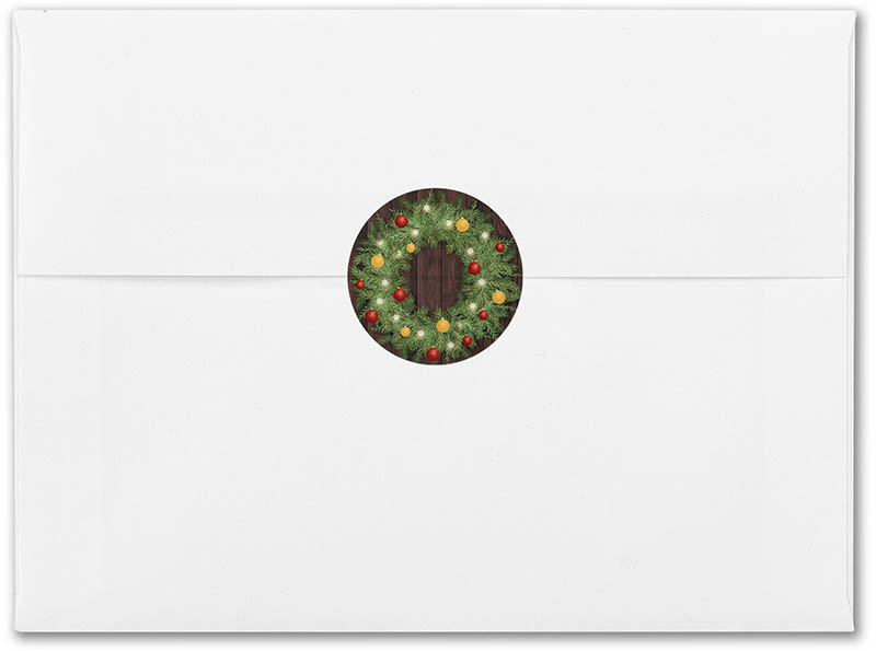 Add a touch of timeless elegance to your holiday correspondence with self-adhesive envelope seals featuring a classic Christmas wreath set against a background of rich dark wood.