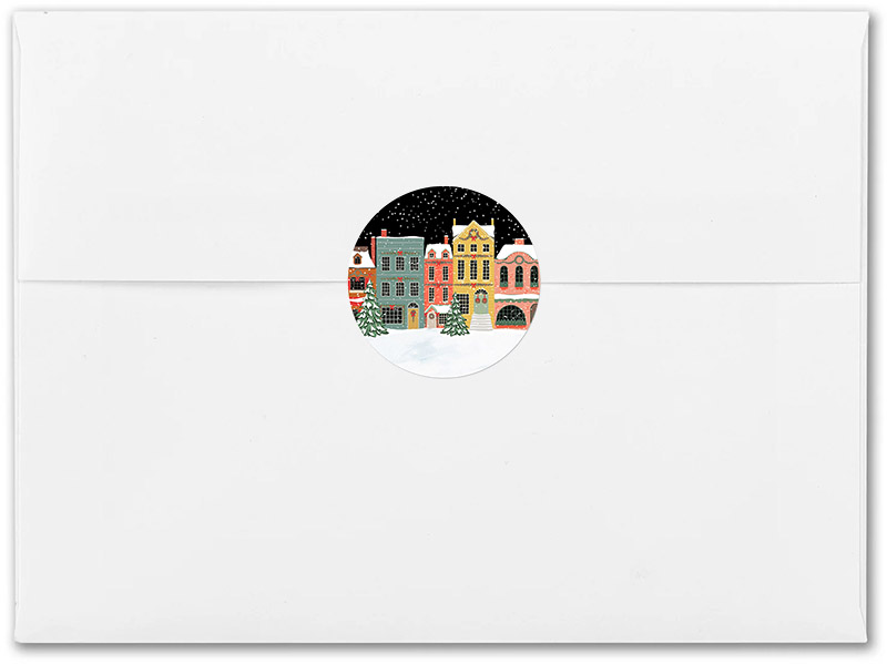 A snowy row of cozy buildings lines this round holiday seal, digitally printed for crisp detail and color. A festive finish for envelopes or seasonal packaging.
