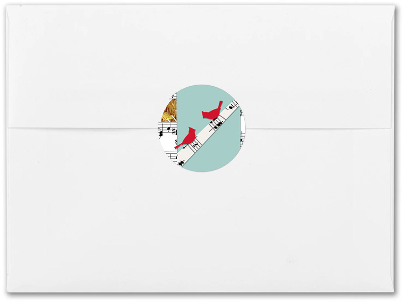 This holiday seal features cardinals perched on sheet music for a festive, artistic vibe. Digitally printed in full color for stylish envelope accents.