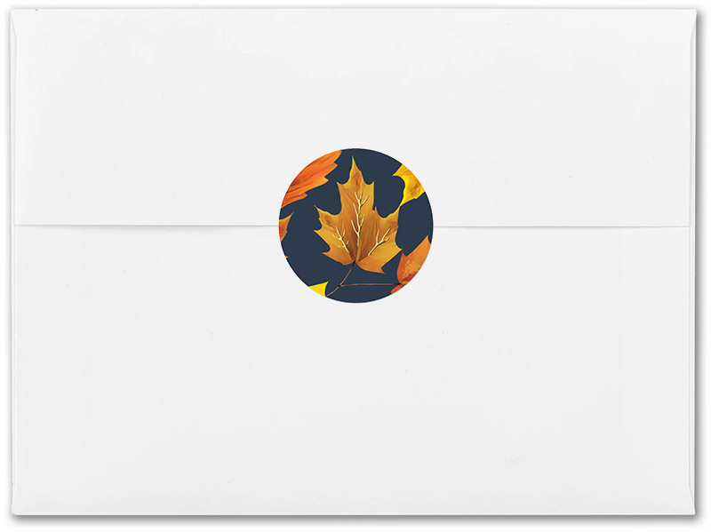 A close-up of fall leaves makes this round holiday envelope seal warm and welcoming. Enhanced raised foil adds sheen to this finishing touch.