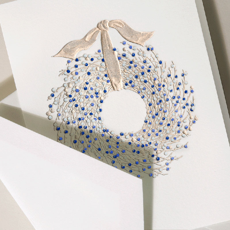 Wherever it's hung, a wreath of juniper berries offers a festive, welcoming trimming for the holiday season. The silver tie adds just the right amount of sparkle to this beautifully engraved card.