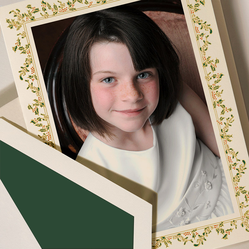 Boxed holiday photo mount cards sold in sets of 10 cards (using 64 lb. ecru kid finish cardstock) and 10 hunter lined envelopes.