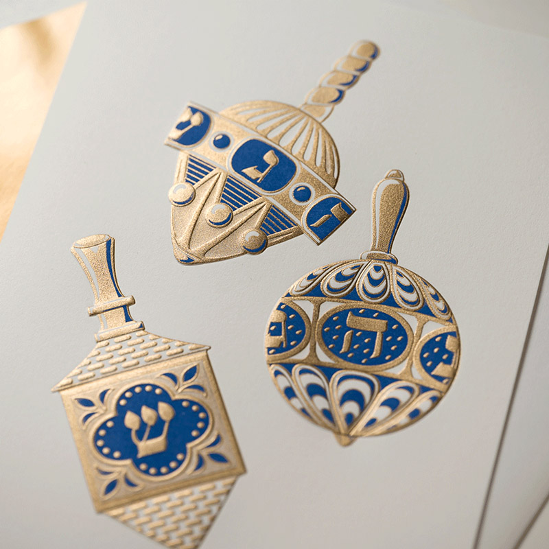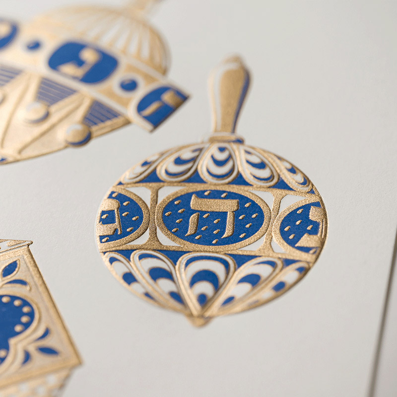 Folded boxed hanukkah greeting cards sold in sets of 10 cards (using 64 lb. Pearl White Kid Finish cardstock) and 10 Satin Gold lined envelopes.