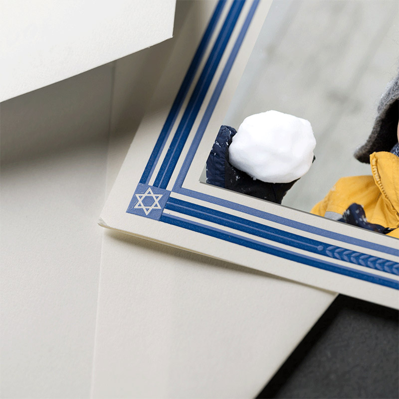 A refined take on holiday tradition, the Classic Hanukkah Photo Mount Holiday Card offers understated elegance and heartfelt sentiment. Framing your cherished photo is a border engraved in shades of blue, each corner adorned with a delicately rendered Star of David—a timeless symbol of the season.