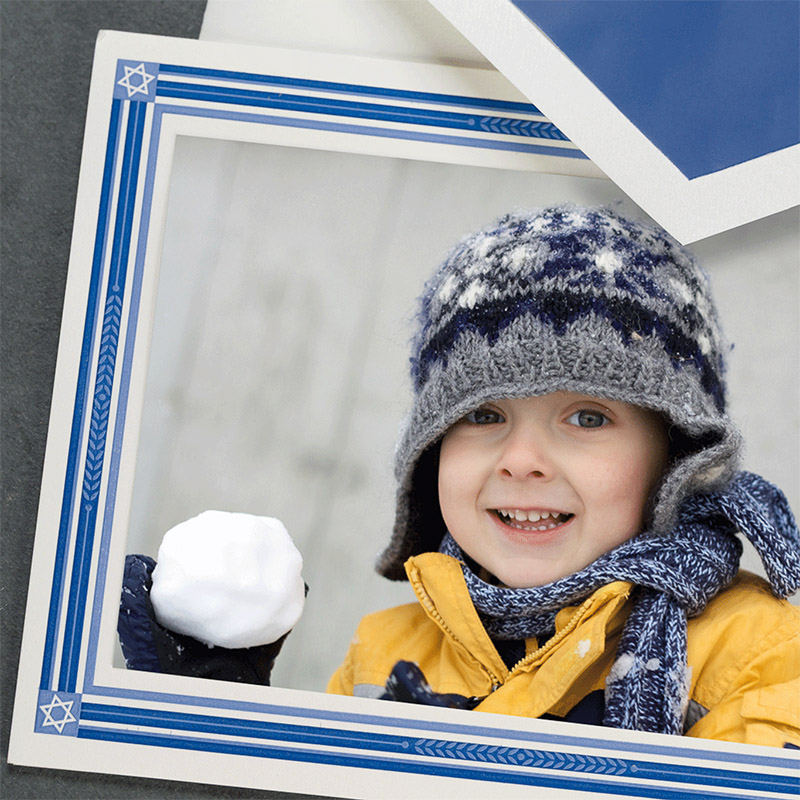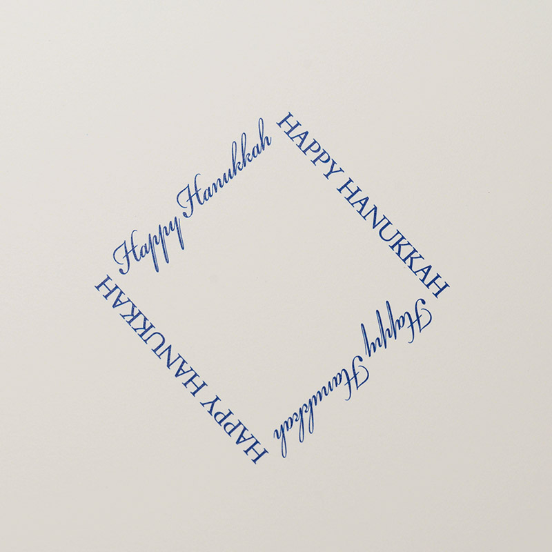 Inside, the message "Happy Hanukkah" is digitally printed in regal regent blue ink in a versatile diamond-shaped layout (and cannot be changed or personalized), ideal for either portrait or landscape photo orientation.