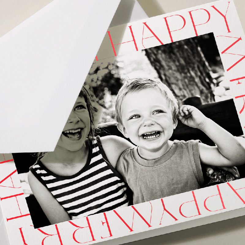 Your photo is surrounded by the words "MERRY" and "HAPPY" stamped in red foil.