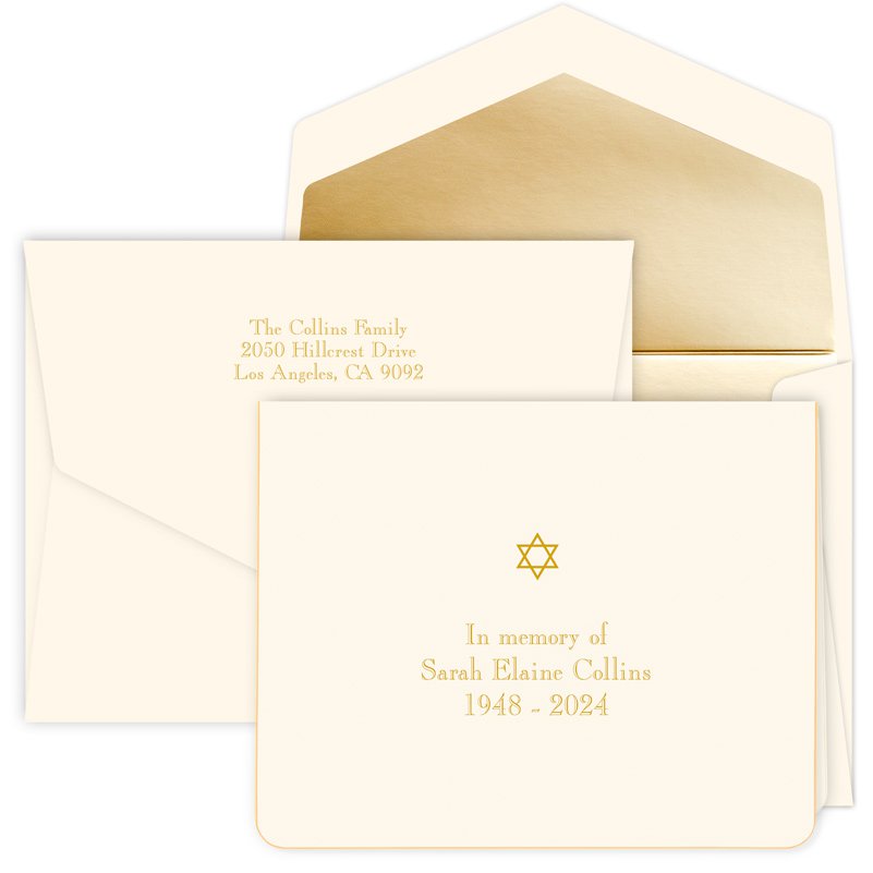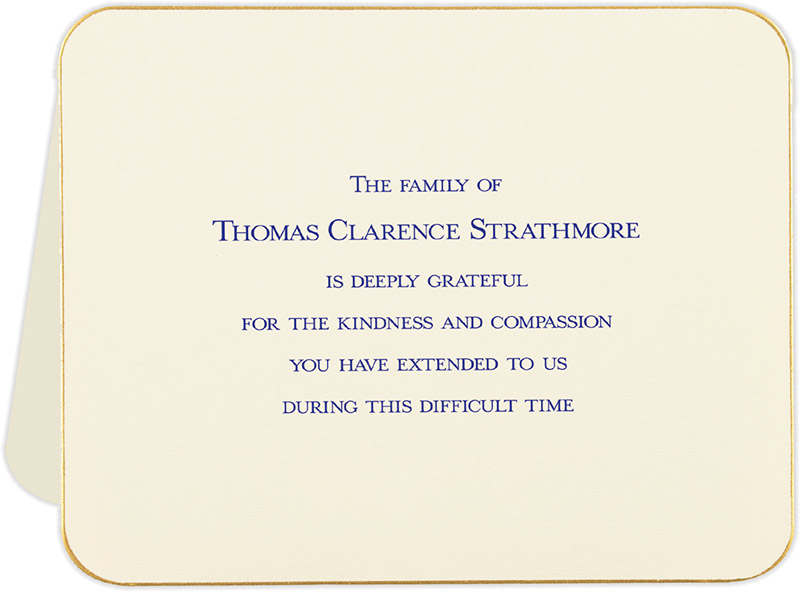 Folded sympathy notes with rounded gold border available in ivory paper only.