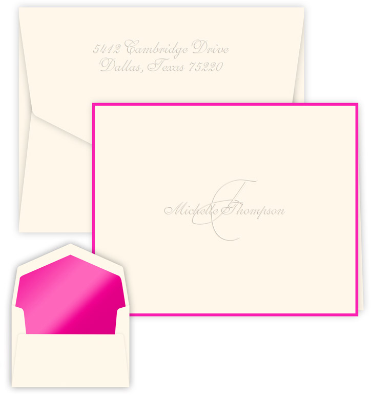 The design of our Monte Carlo Note Embossed features your name and an enlarged single initial intertwined and deeply blind embossed (no ink) into your choice of paper color.