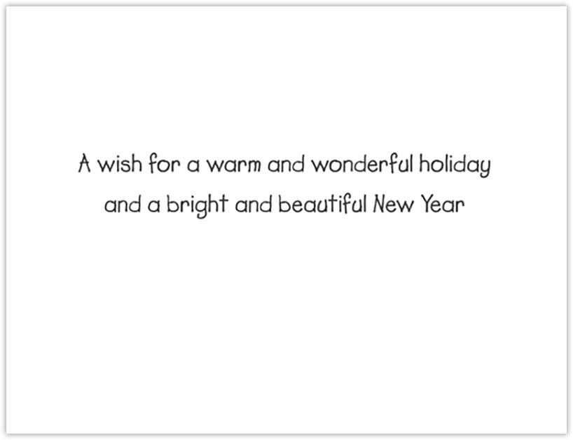 Folded charity holiday greeting card printed on chlorine-free recycled paper with soy based ink. Card contains a pre-printed sentiment on the inside and cannot be personalized.