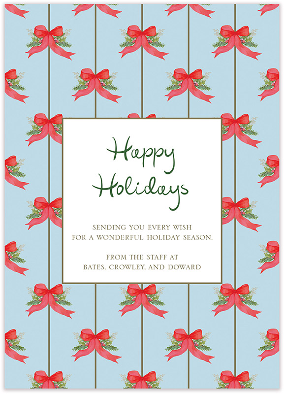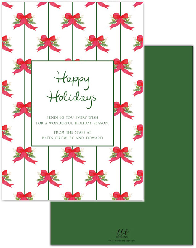 Flat holiday greeting cards. You choose the background and border colors for the front and the background color for the back of the cards.