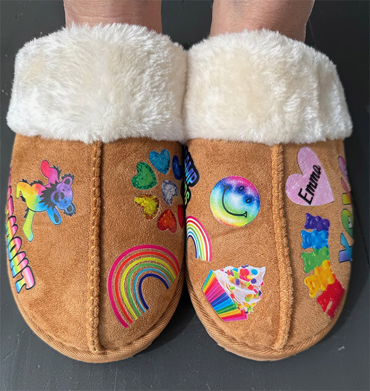 Customized with the decals shown (heat-pressed on to the slipper; decal placement may vary from images shown).