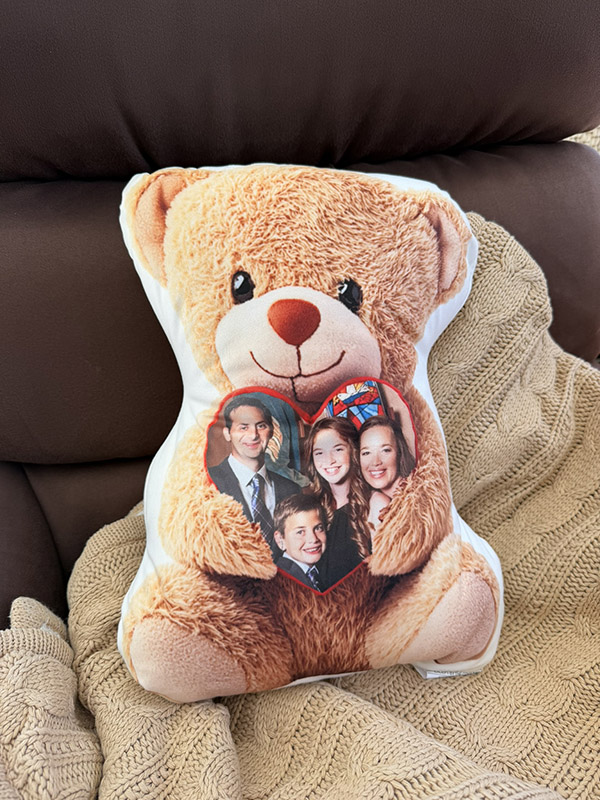 This adorable stuffed pillow features a sweet teddy bear holding a heart — and we’ll print your digital photo you supply right on that heart, creating a one‑of‑a‑kind keepsake your child will treasure all summer long.