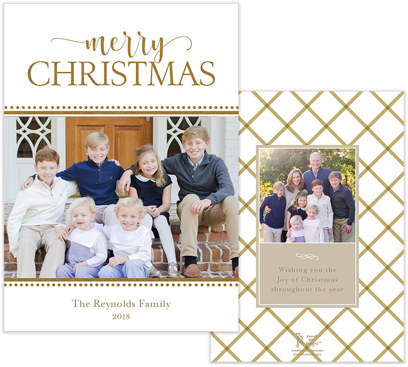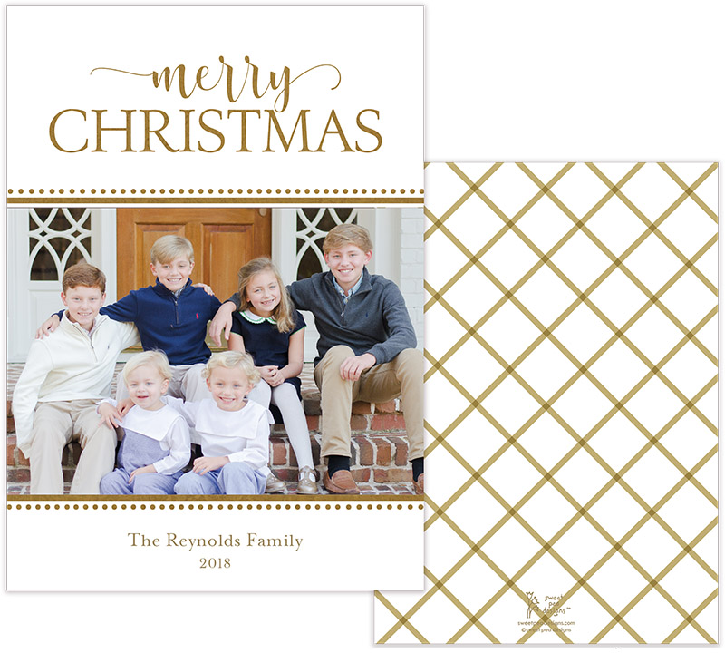 Flat holiday digital photo cards with foil enhancements. You get to select the color of the foil for the words "merry CHRISTMAS", and the dots and lines (shown in Gold here) as well as the background colors for the front and back (white shown).